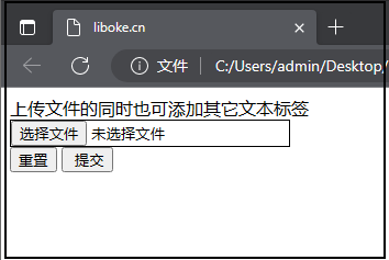 <form action="#" method="post" enctype="multipart/form-data"> <label>上传文件的同时也可添加其它文本标签</label><br/> <input type="file" name="file"/><br/> <input type="reset" value="重置"/> <input type="submit" value=" 提交"/> </form> <style type="text/css"> input[type="file"]{ border:1px solid #000; } </style>![]()