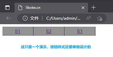 <ul> <li><a href="#">li1</a></li> <li><a href="#">li2</a></li> <li><a href="#">li3</a></li> </ul> <style type="text/css"> ul{ /* 清除默认边框边距 */ margin:0; padding:0; } li{ float:left; width:100px; height:30px; list-style-type:none; /* 清除标记 */ text-align:center; /* 文本水平居中 */ line-height:30px; /* 文本垂直居中,参数是height值 */ background-color:#939393; border-right:1px solid #2d2d2d; } </style>![]()