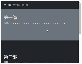 <body data-bs-spy="scroll" data-bs-target="#daohang" data-bs-offset="50"> <!--导航栏--> <nav id="daohang" class="container-fluid navbar navbar-expand-sm bg-dark navbar-dark fixed-top"> <ul class="navbar-nav"> <li class="nav-item"> <a class="nav-link" href="#nr1">第一部</a> </li> <li class="nav-item"> <a class="nav-link" href="#nr2">第二部</a> </li> <li class="nav-item"> <a class="nav-link" href="#nr3">第三部</a> </li> </ul> </nav> <!--容器内容--> <div id="nr1" class="container-fluid bg-secondary text-white" style="padding:100px 20px;"> <h1>第一部</h1> <p>内容。。。。。。。。。。。。。。。。。。。。。。。。。。</p> </div> <div id="nr2" class="container-fluid bg-dark text-light" style="padding:100px 20px;"> <h1>第二部</h1> <p>内容。。。。。。。。。。。。。。。。。。。。。。。。。。</p> </div> <div id="nr3" class="container-fluid bg-light" style="padding:100px 20px;"> <h1>第三部</h1> <p>内容。。。。。。。。。。。。。。。。。。。。。。。。。。</p> </div> </body>![]()