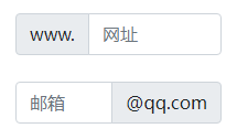 <!--前缀--> <div class="input-group"> <span class="input-group-text">www.</span> <input type="text" class="form-control" placeholder="网址"> </div> <!--后缀--> <div class="input-group"> <input type="text" class="form-control" placeholder="邮箱"> <span class="input-group-text">@qq.com</span> </div> 注: 1.<span>可以内嵌其它表单标签,如复选框、单选框、选择框 2.<span>可以用其它组件代替,如按钮、下拉菜单可以有多个<span>、<input>: