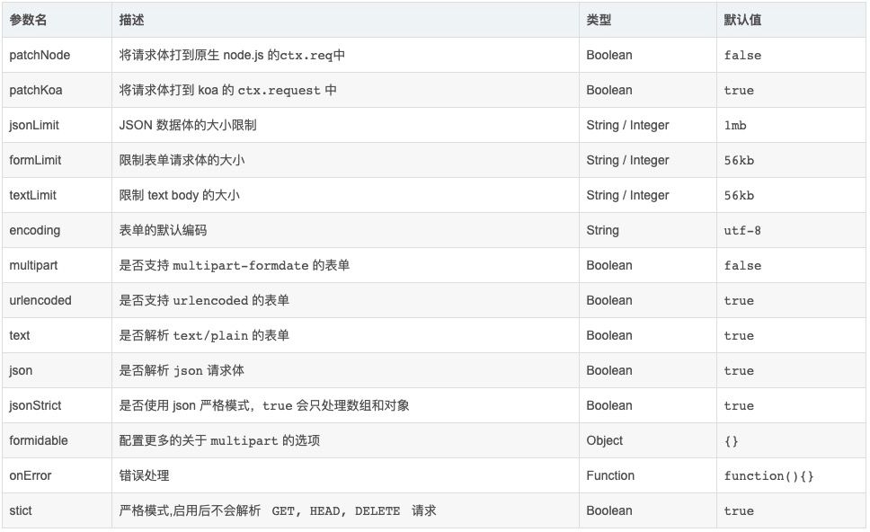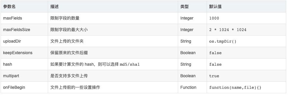 HTML: <form action="/form1" method="post" enctype="multipart/form-data"> <input type="text" name="name" /> <input type="file" name="file1"/> <input type="file" name="file2"/> <input type="submit" value="提交" /> </form> JS后台: const koabody = require("koa-body").default; const fs = require('fs'); const koa = require("koa"); const app = new koa(); //设置koa-body参数 app.use(koabody({ //其它设置参考最后面 multipart: true, //允许文件表单 jsonLimit: "5mb", // body体的大小 formidable: { maxFileSize: 100 * 1024 * 1024 // 设置上传文件大小最大限制,默认2M } })); app.use(async ctx => { if(ctx.method == "POST" && ctx.path == "/form1"){ // ctx.request.body //获取text表单,{ name: 'abc' } //------------------------------------------ //加载了koa-body中间件,才有files属性 var file = ctx.request.files.file1; //获取file文件,最后的file是HTML中<input name="file"/>属性,根据设置修改 var rfile = fs.createReadStream(file.filepath); //读取上传文件,转化为文件流 var wfile = fs.createWriteStream(__dirname + "/upload/" + file.originalFilename); // 写入文件,创建写入流 rfile.pipe(wfile); //保存文件 //上传文件信息 //file.filepath 上传文件临时路径 //file.originalFilename 文件名,a.txt //file.size 文件大小 //file.mimetype 文件类型,text/plain、application/x-zip-compressed //lastModifiedDate 上传时间 } });koa-body