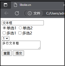 <form action="#" method="post"> <input type="text" name="text" value="文本框" /><br/> <input type="radio" name="danxuan" value="单选1" checked="checked"/>单选1 <input type="radio" name="danxuan" value="单选2"/>单选2<br/> <input type="checkbox" name="duoxuan" value="多选1"/>多选1 <input type="checkbox" name="duoxuan" value="多选2"/>多选2<br/> <select name="select"> <option value="1" selected="selected">1</option> <option value="2">2</option> </select> <br/> <textarea name="textarea">多行文本框</textarea> <br/> <input type="reset" value="重置"/> <input type="submit" value=" 提交"/> </form> 注:表单提交时会自动获取标签的value值![]()
