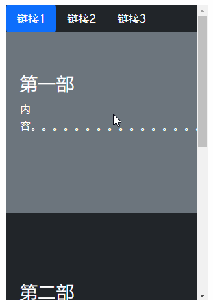 <body data-bs-spy="scroll" data-bs-target="#daohang" data-bs-offset="50"> <!--导航栏--> <ul class="container-fluid nav nav-pills bg-dark fixed-top" id="daohang"> <li class="nav-item"> <a class="nav-link text-light" href="#nr1">链接1</a> </li> <li class="nav-item"> <a class="nav-link text-light" href="#nr2">链接2</a> </li> <li class="nav-item"> <a class="nav-link text-light" href="#nr3">链接3</a> </li> </ul> <!--容器内容--> <div id="nr1" class="container-fluid bg-secondary text-white" style="padding:100px 20px;"> <h1>第一部</h1> <p>内容。。。。。。。。。。。。。。。。。。。。。。。。。。</p> </div> <div id="nr2" class="container-fluid bg-dark text-light" style="padding:100px 20px;"> <h1>第二部</h1> <p>内容。。。。。。。。。。。。。。。。。。。。。。。。。。</p> </div> <div id="nr3" class="container-fluid bg-light" style="padding:100px 20px;"> <h1>第三部</h1> <p>内容。。。。。。。。。。。。。。。。。。。。。。。。。。</p> </div> </body>![]()